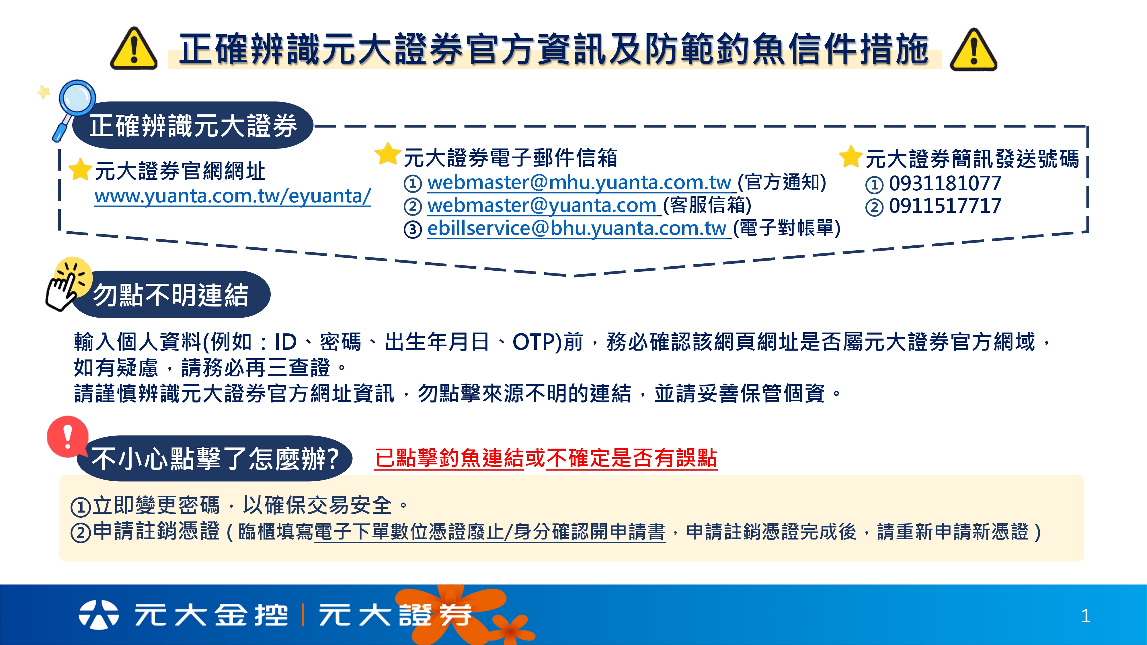 邇來有發現不明人士以證券公司名義廣發釣魚信件,偽稱官方APP或電子平台完成系統安全升級作業,需點擊連結下載更新,企圖誘投資人點選電子郵件內之不明連結進入釣魚網頁,若依網頁指示輸入帳號、密碼及簡訊動態驗證碼(OTP)等重要個資,即會遭詐騙集團冒名申請憑證進行交易。請投資人勿點不明連結,並妥善保管個資。