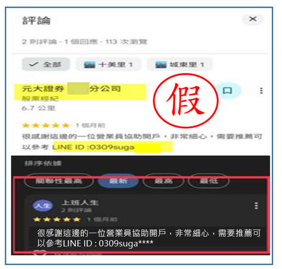 近期不明人士在本公司相關分公司之Google Maps 評論區或社群平台留言,以推薦營業員為由,企圖引導民眾加入不明LINE ID。