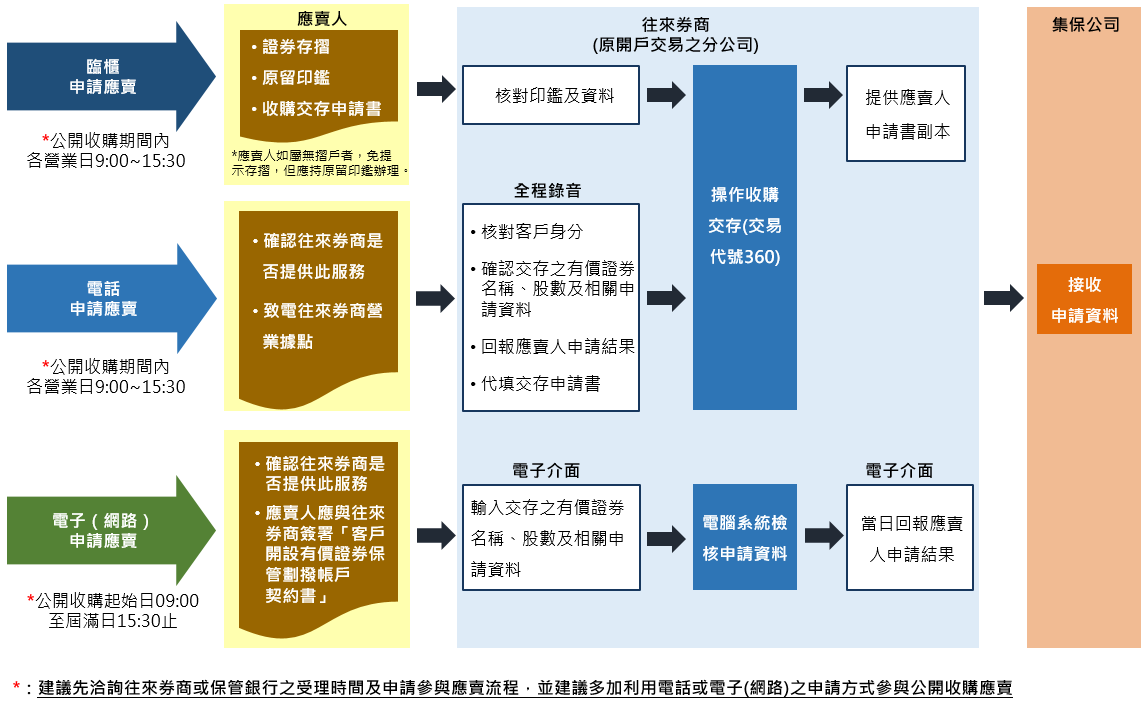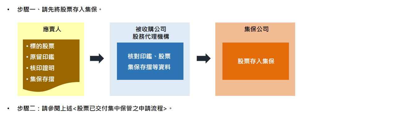 應賣人如已將其持有之被收購公司股票交付集中保管者,得採取下列方式之一,向往來證券商或保管銀行申請參與應賣及交存有價證券,申請流程請見以下圖示說明。