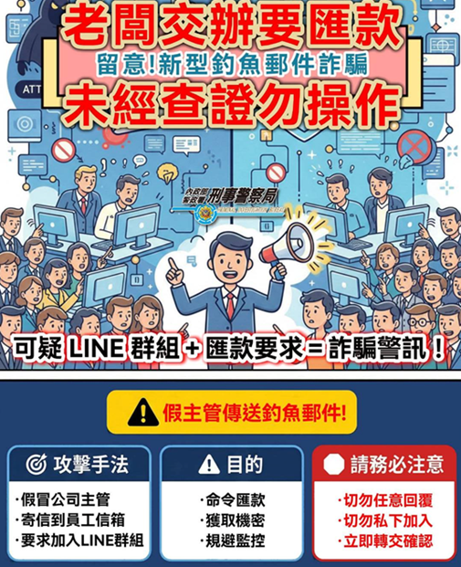 詐騙手法層出不窮,日常務必提高警覺!內政部警政署分享,歲末年終,詐騙集團趁機假裝成公司負責人或主管傳送釣魚郵件,要求員工加入新建之LINE群組,並詢問公司剩餘多少流動資金,隨後聲稱有訂單急需當天付訂,要求員工立刻電匯至指定帳戶。