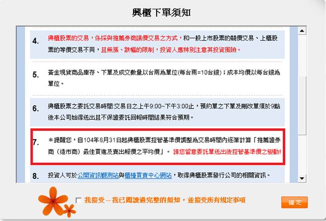 ◎「警示訊息」:委託買賣興櫃股票、開放式基金受益憑證及黃金現貨等商品申報委託價格達