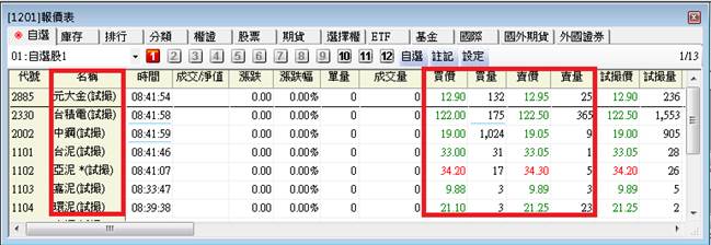 1.[1201]報價表於該商品有揭示試撮資訊時商品名稱顯示「(試撮)」字樣,且「買價」、「買量」、「賣價」、「賣量」欄位亦提供試撮資訊。