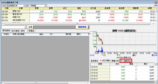 四、元大國際期貨版面-成交明細增加「自動定位」功能。