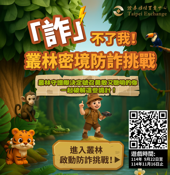 為響應主管機關防制金融投資詐騙政策,證券櫃檯買賣中心自114年9月22日起至11月16日止為期8週推出「詐不了我!叢林密境防詐挑戰」線上遊戲,以寓教於樂的方式讓民眾認識常見的詐騙手法並提升防詐意識。只要完成詐騙測驗並輸入手機號碼,就有機會抽中100點LINE POINTS喔! 歡迎投資人踴躍參加。