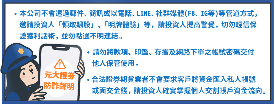 一旦收到有疑慮的推薦投資或是保證獲利等訊息,請不要聽信跟理會,並可撥打「165」警政署反詐騙專線查證, 如果該訊息中有假借本公司名義之行為,也可以向本公司反詐騙諮詢專線或信箱反映與查證,遭受詐騙可另行檢具相關具體事證向警政單位報案或司法檢調機關提出檢舉。